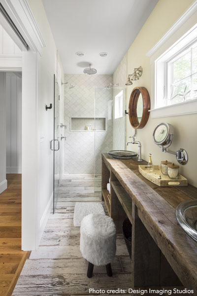 - Likewise, choose fixtures and hardware that combine modern functionality with a vintage aesthetic. A warm, wooden vanity with a granite top is a perfect fit — shaker style is an option here too.