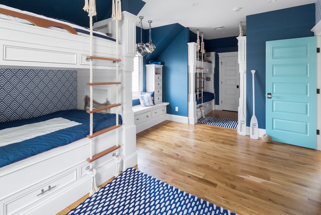 Nautical features and colors keep the Cape theme in an updated bedroom. Dormers provide opportunities for seating and built-in bedding.