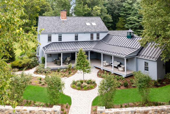 Backyard landscaping expands a home's modern Colonial look-and-feel with even more space for play, entertainment, or just enjoying New England's seasons.
